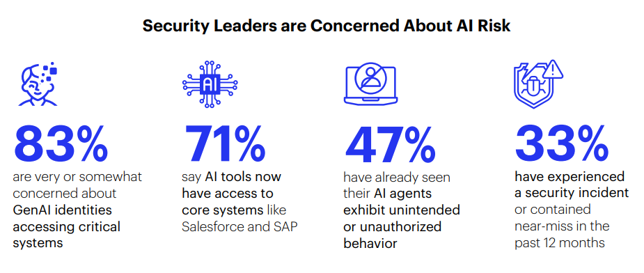 Eighty-three percent of security leaders say they’re concerned about AI access. And nearly half (47%) have already observed AI agents exhibit unintended or unauthorized behavior. A third of organizations dealt with an actual security incident or near-miss in the past year. These aren’t hypothetical risks, they’re operational failures CISOs are already containing. But as AI moves faster, the risk increases. These agents act with system-level access, often with no clear owner and outside traditional enforcement models. Each AI integration becomes its own identity that needs to be governed like any other high-risk user.
