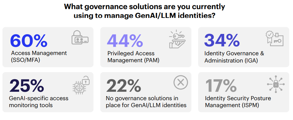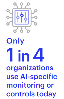 Sixty percent still use traditional login-based authentication patterns like session management or password policies for AI identities that instead need API-first controls, like token lifecycle management, scope-limited authorization, and runtime enforcement. Only one in four organizations use AI-specific monitoring or controls today.