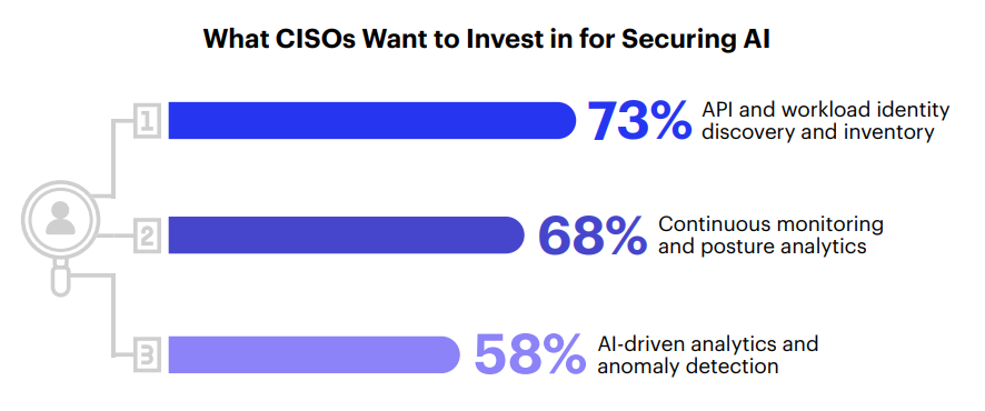 That’s why visibility and monitoring are now top investment priorities. According to the data, if budget wasn’t an issue, 73% of CISOs would be focusing on API and workload identity discovery and inventory. Another 68% would prioritize posture analytics and continuous monitoring. The goal is not just detection, but to answer simple questions in real time: What does this AI identity have access to? Who authorized it? What is it doing? Does it still need this access? Has it created other AI identities?