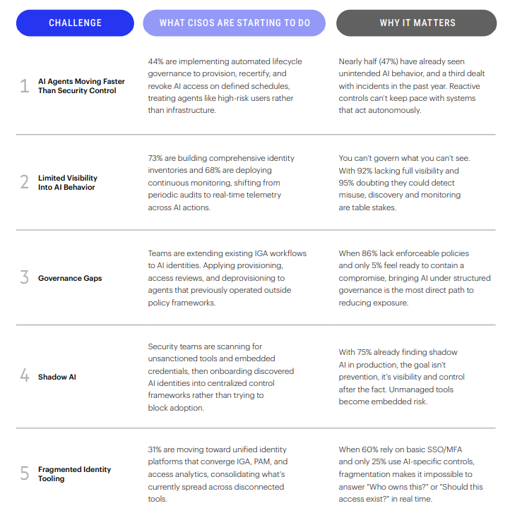 Most organizations are juggling too many point solutions that barely keep up with today’s human users and applications. Add AI identities on top of that, and the cracks in those older tools become impossible to ignore. Let this be the moment to straighten out your entire identity security program, retiring the outdated IGA tech and moving toward something built for how your organization actually works today. The report reflects a move (31%) toward unified identity platforms that converge IGA, PAM, and access analytics, consolidating what’s currently spread across disconnected tools. (See page 11, “How CISOs Are Responding.”)