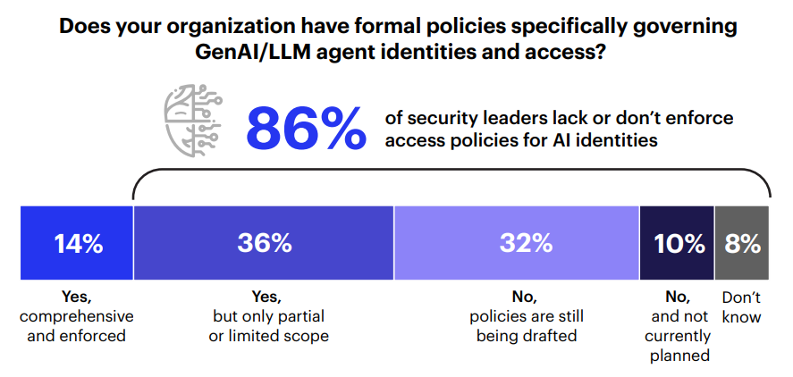 - 86% don’t enforce access policies for AI identities. Only 17% govern even half of their AI identities like human users, and just 5% feel confident they could contain a compromised agent.
