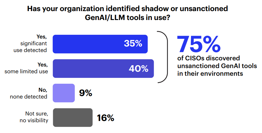 In many organizations, AI isn’t just being rolled out by IT through sanctioned projects. Instead, “Shadow AI” is showing up through unapproved AI tools that teams bring in on their own. Three out of four CISOs have discovered unsanctioned GenAI tools already running in their environments. Another 16% aren’t sure, which likely means they have the same problem.