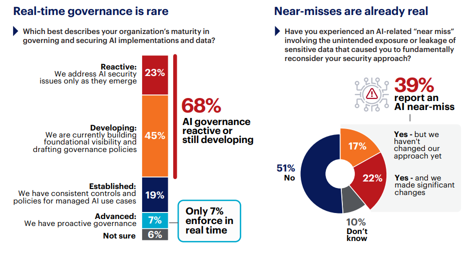 Today, 68% of organizations describe their AI governance as reactive or still developing. Only 7% have reached advanced maturity with real-time policy enforcement. The 66-point gap between the 73% deploying AI tools and the 7% governing them in real time is a structural mismatch—organizations are building at production speed on a security and compliance foundation that barely exists. And the consequences are starting to show, with 39% having already experienced an AI-related near-miss involving unintended data exposure. Of those, 17% changed nothing afterward.