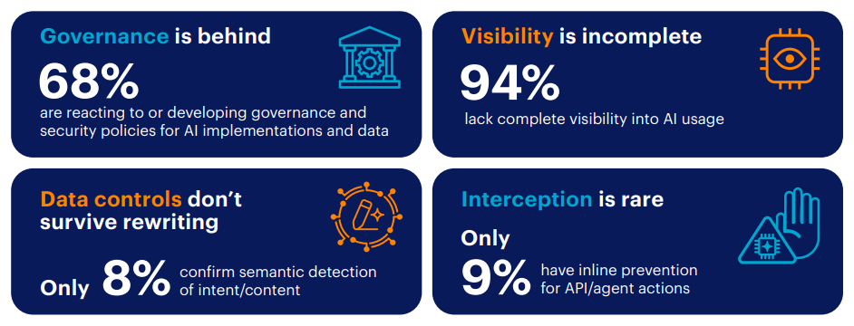 AI-driven risk is expanding from human misuse to machine autonomy, and the controls are still working to address the first challenge. The survey points to four architectural priorities: continuous visibility into all AI activity including agent and M2M traffic, inline enforcement without creating friction and latency, semanticaware data controls that evaluate meaning rather than patterns, and extending zero trust to non-human identities (NHIs). The chapters that follow measure how mature most organizations are, and how to close the execution gap.