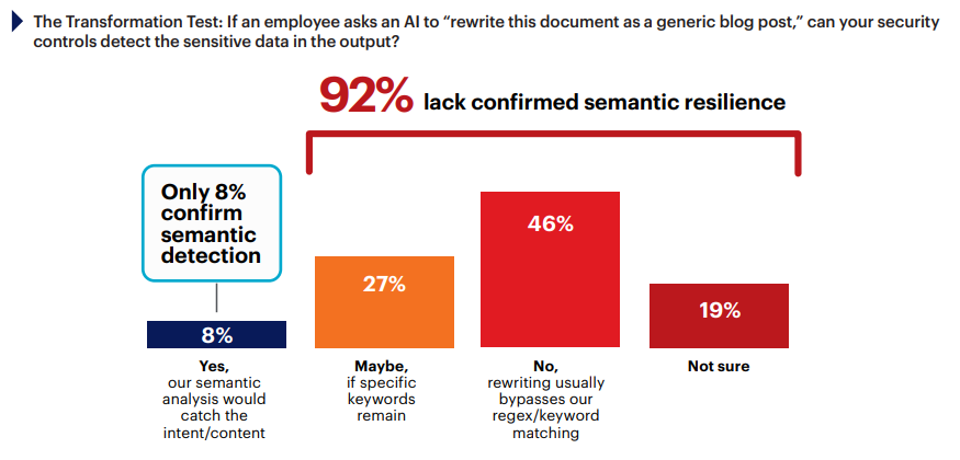 The distinction is architectural. DLP operates at the syntactic layer, matching character sequences against predefined rules. AI operates at the semantic layer, transforming content while preserving intent. A simple transformation test makes it concrete: If an employee takes a secret project description and asks an AI to “summarize this into a professional email,” the AI may replace “Project X” with “our upcoming strategic initiative.” To a regex filter, “strategic initiative” looks perfectly safe, even though the semantic value (the secret) remains identical. Similar issues emerge when translating English secrets into a second language and back. AI generates a version of the data where every original keyword has been replaced, yet the underlying risk remains unchanged. Traditional DLP also fails at inference. It may scan two separate lists—one of names and one of medical conditions—and find them harmless in isolation, but an AI can rephrase the document to explicitly link the two, creating a HIPAA violation that a pattern-based DLP filter cannot see. 46% said their controls would miss these kinds of policy violations because rewriting typically bypasses regex and keyword matching. Another 27% said detection works only if specific keywords survive the transformation, a control that functions only when the adversary cooperates. Combined with the 19% unsure of their coverage, 92% of organizations lack DLP confirmed to work after AI rephrases content.
