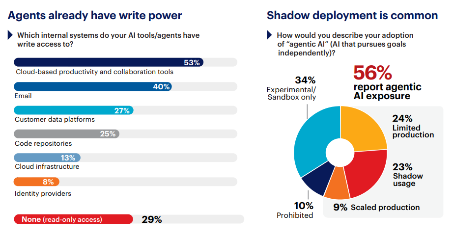 The survey quantifies how far this has spread. 56% report real agentic AI risk exposure: 24% in limited production, 9% at scale handling core business logic, and 23% through shadow deployments IT doesn’t know about. 32% have zero visibility into agent actions, and 36% are blind to M2M AI traffic entirely.