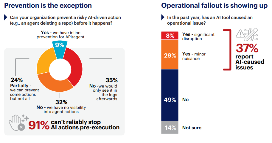 Agents have broad access across enterprise systems, and almost none of it can be intercepted. Once an agent initiates a harmful action, only 9% of organizations can intervene before it completes. The remaining 91% breaks down into degrees of helplessness: 24% can block some agent actions but not all, 35% would find the action only in logs after it completed, and 32% have no visibility into agent actions whatsoever. For every ten organizations running agentic AI, fewer than one can stop an agent from deleting a repository, modifying a customer record, or escalating a privilege before the action executes.