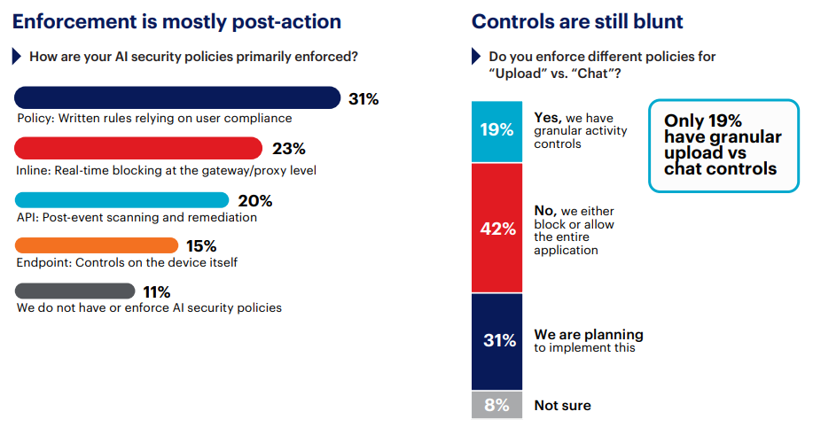 31% rely on written policies and employee compliance as their primary enforcement. Another 11% have nothing at all. Only 23% say they enforce AI security inline, at the point of action.