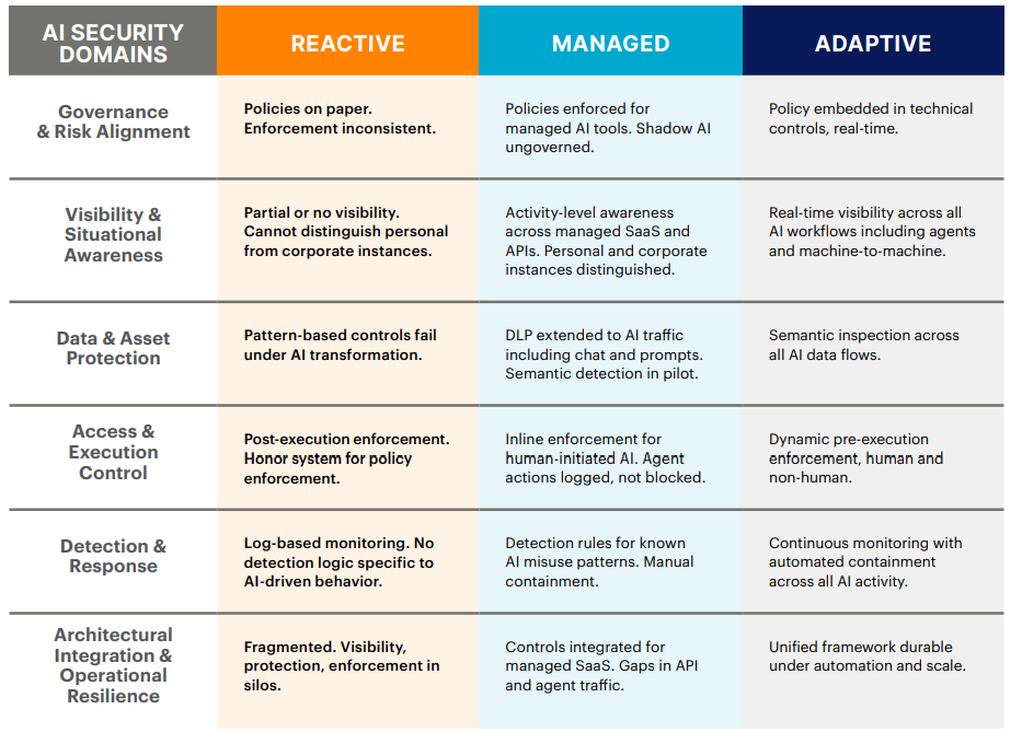 Each gap examined so far amplifies the others: weak visibility undermines DLP, ungoverned agents bypass access controls, and fragmented enforcement leaves every layer exposed. The Capability Maturity Model below maps six core AI security domains across three tiers of readiness. Each cell describes the capabilities at that stage. Find the description that matches your organization in each row. The domain with the lowest maturity is your weakest link and most likely point of failure. That is where investment should go first.