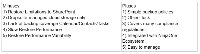 Features consist of encryption, built-in deduplication to help save on storage costs, ransomware protection, and while being a primarily N-able cloud solution allows for Microsoft 365 consistent backup and recovery of components such as OneDrive, SharePoint, etc.