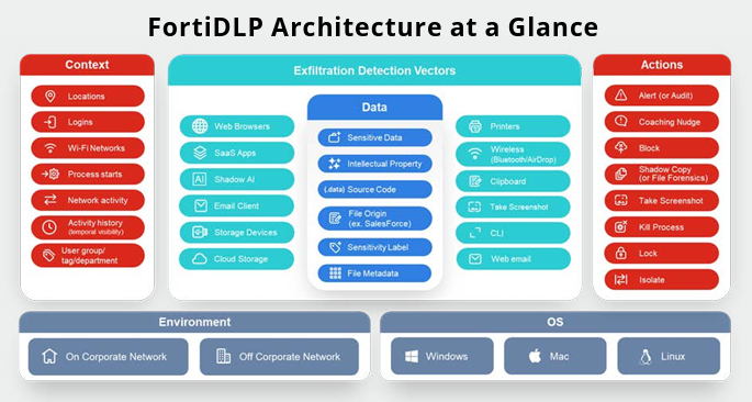 FortiDLP operates as a cloud-native unified DLP and Insider Risk solution supported by lightweight Windows, macOS, and Linux agents and enterprise cloud drive connectors for Microsoft 365, Google Workspace, and Box.
