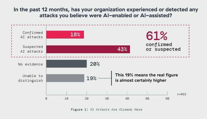 In this report, “AI-enabled attack” refers to attack activity where respondents observed AI being used to increase speed, scale, or sophistication – for example automated reconnaissance, AI-generated social engineering, rapid exploit adaptation, or evasion techniques. The classification reflects what defenders observed and attributed in their environments, not laboratory-grade certainty.