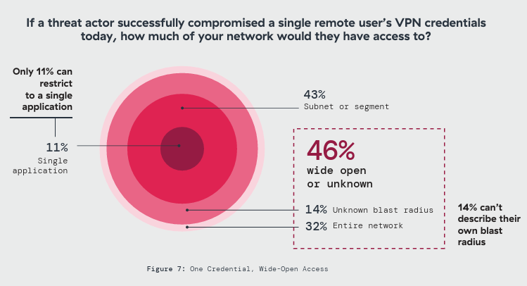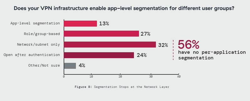 Segmentation gaps make lateral movement easier to operationalize. 56% have no per-application segmentation through VPN, and 24% provide entirely open access after authentication. The result is a structural mismatch: defenders may detect an intrusion, but lack the access controls to contain it quickly.
