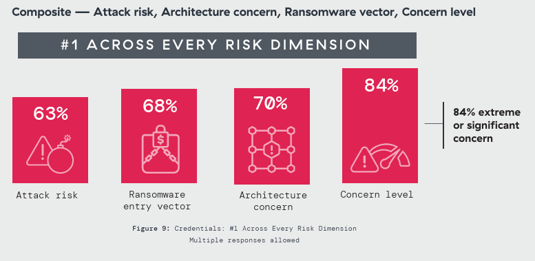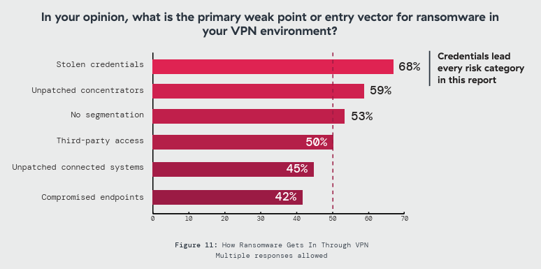 Credential theft dominates every risk dimension the survey measured. As the greatest VPN attack risk, 63% named it first. As an architecture concern, 70% ranked it the top threat. As a ransomware entry vector, 68% placed it above all alternatives. 84% expressed extreme or significant concern. No other finding achieved that consistency.