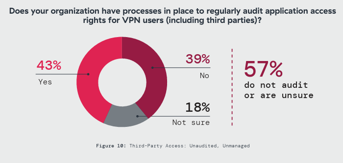 The reason is structural. VPN authenticates once at the perimeter and extends network access from that single event. Anyone holding a valid credential inherits whatever access the legitimate user had, often far more than the role requires. Yet 57% of organizations do not audit the third-party access those credentials unlock.