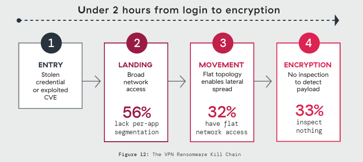 The survey data maps onto this kill chain precisely: broad access in 56% of environments, flat topologies in 32%, zero inspection in a third. 83% rank ransomware through VPN as a top-tier concern – yet 53% report no meaningful segmentation to slow it down. The concern is nearly universal; the capability to act on it barely exists.