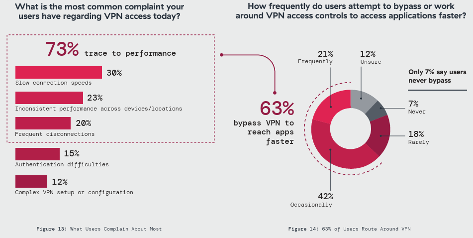 63% report that users intentionally bypass VPN controls to reach applications faster. When nearly two-thirds of the workforce routes around the security perimeter, every bypassed session flows uninspected and unmonitored. Controls that users consistently route around do not meaningfully reduce risk.