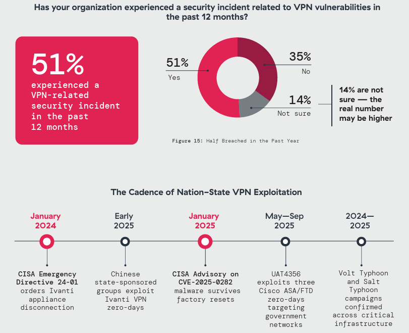 In this survey, 51% of organizations reported a VPN-related security incident in the past twelve months – a figure that spans every sector, not just the critical infrastructure these campaigns targeted.
