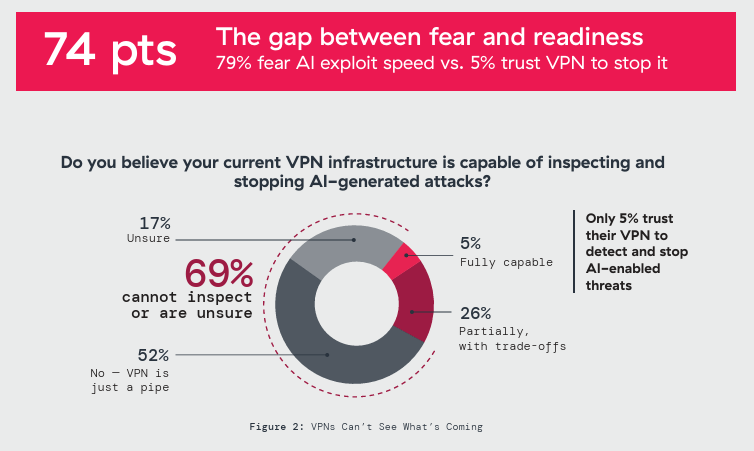 Defensive readiness has not kept pace. Over half say legacy VPN infrastructure blocks integration of AI-driven security tools entirely, which is why only one in four has managed to deploy AI-powered monitoring. 79% fear AI will weaponize vulnerabilities faster than they can patch, yet only 5% trust their VPN to detect and stop AI-enabled threats when patching fails. That 74-point gap between fear and readiness defines the defensive crisis this report measures.
