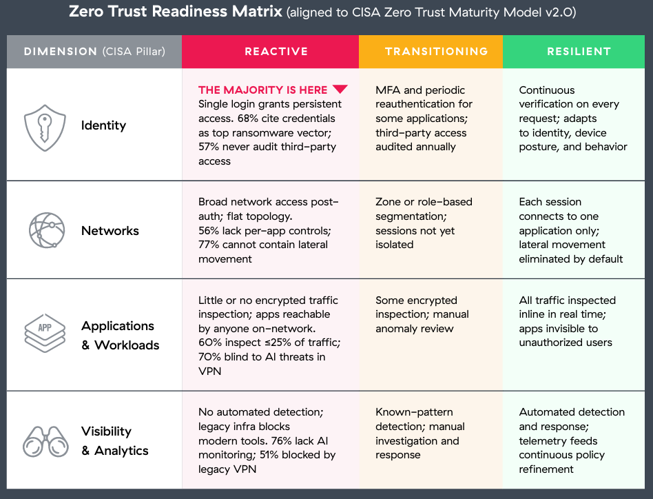 This assessment is structured around the CISA Zero Trust Maturity Model v2.0, scoped to the access risks this survey measured. Two CISA pillars, Devices and Data, fall beyond this survey’s scope; organizations should assess those independently. The three maturity stages align to the progression CISA describes from Traditional through Optimal. In every dimension, the majority of respondents fall in the Reactive tier. The lowest-rated dimension typically represents the fastest path an attacker will take.
