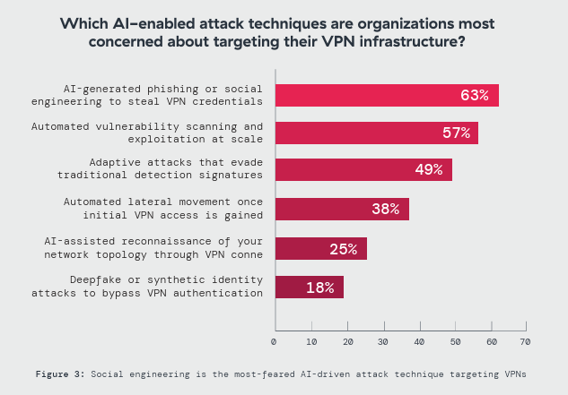 Which AI-enabled attack techniques are organizations most concerned about targeting their VPN infrastructure? The clear leader is AIgenerated phishing or social engineering to steal VPN credentials (63%)—ahead of automated vulnerability scanning and exploitation at scale (57%) and adaptive attacks that evade traditional detection signatures (49%). That ordering matters: it signals that for many adversaries, the fastest path to VPN compromise isn’t “breaking in,” but logging in.