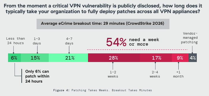Only 6% of organizations can deploy a critical VPN patch within 24 hours. The majority, 54%, need a week or more. The CrowdStrike 2026 Global Threat Report measured average eCrime breakout time at 29 minutes in 2025, with the fastest observed at 27 seconds.¹ For many organizations, compromise occurs before their patch process clears the first approval gate.