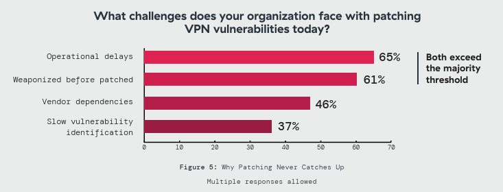 Security teams spend more time maintaining VPN than defending what sits behind it. 73% say VPN demands more operational effort than modern alternatives. The top drivers: patching complexity (56%) and integration struggles with modern security stacks (50%). As one survey respondent put it, more time goes to patching the entry point than securing the actual data behind it.