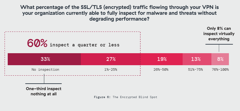 One-third of organizations inspect zero encrypted VPN traffic for threats. Add the 27% examining less than a quarter, and 60% of enterprises run remote access with minimal or no visibility into what crosses it. Only 8% can inspect virtually everything. 83% rank ransomware through VPN tunnels as a top concern, yet 60% barely look at what’s inside them. The gap is even wider for AI-enabled threats: 70% report limited or no visibility into AI attacks traversing VPN connections. The organizations with the most to fear have the least ability to see it coming.