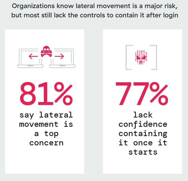 56% have no per-application segmentation through VPN, and 24% provide entirely open access after authentication. Almost everyone who recognizes the threat also lacks the means to address it: 81% flagged lateral movement as a top concern, yet 77% lack confidence in containing it.